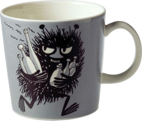 Muumimuki Haisuli: Kepposteleva, pörröinen Haisuli on taas pihistänyt Muumilaakson asukkaiden tavaroita ja mennä jolkottaa karkuun pitkin muumimukin kylkeä.