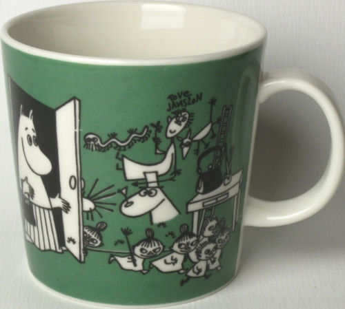 Muumimuki Piirustus: Ovesta sisään astuva Muumimamma saa ihmetellä, että mitä sisällä talossa on tapahtunut. Taustapuolella Muumipappa keskittyneenä katselee piirtämäänsä kuvaa ja Muumipeikko seisoo tikapuilla pensselin kanssa levittäen maalia kattoon. Maalia on juuri tipahtanut hänen nenänsä päälle. Tämän mukin valmistus loppui vuonna 2002 ja tämänkin arvo on jo satoja euroja.
